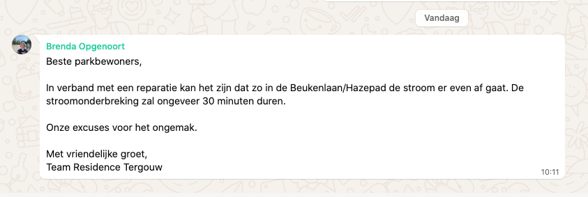 9-10-2025 Op 8-10-2025 meldde Martin van de Heiden, kavel 29, in de ‘TG Vrije parkpraat’-appgroep om 20:08 uur dat de stroommeter in de buitenkast tussen kavel 28 en 29 in de fik was gevlogen. Een medewerker van Tergouw deelde in de ‘RT info app’ op 9-8-2025, 10:08 uur mede, dat de stroom er 30 mintuten af zou gaan. Uiteindelijk bleek dit 70 minuten van 10:25 uur tot 11:35 uur. Het bewijsmateriaal is aan de ACM doorgegeven.